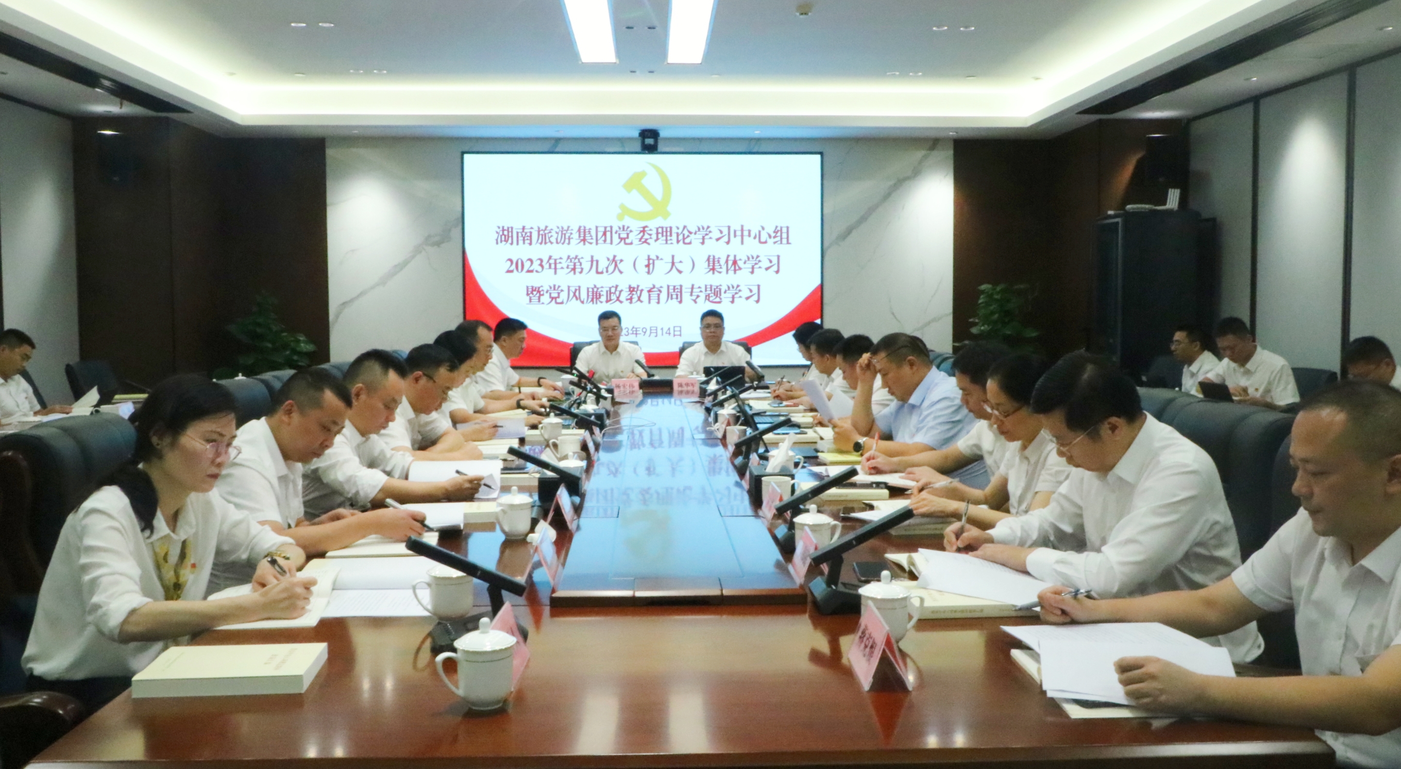 9月14日,湖南旅游集团党委理论学习中心组召开2023年第九次(扩大)集体学习暨党风廉政教育周专题学习会,进一步教育引导集团党员干部坚定理想信念、筑牢思想防线。湖南旅游集团党委书记、董事长杨宏伟主持会议并讲话,集团在家党委班子成员出席会议。