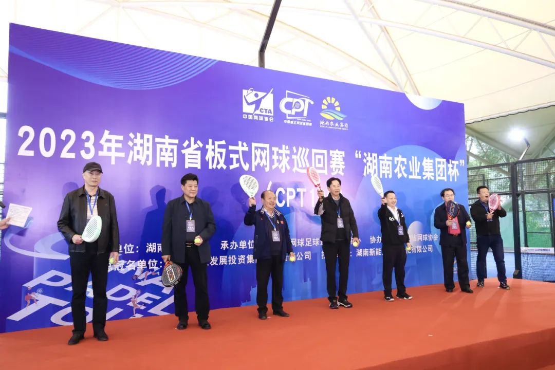 11月25日上午,由湖南农业集团总冠名的2023年湖南省板式网球巡回赛“湖南农业集团杯”CPT-100在长沙开赛。湖南省政协常委、省政协文教卫体委员会副主任、省体育总会主席李舜,集团党委副书记、副董事长、总经理杨正华,省体育局二级巡视员傅力强,省网球足球运动管理中心主任崔恒等领导、嘉宾出席赛事开幕式,并为比赛开球。
