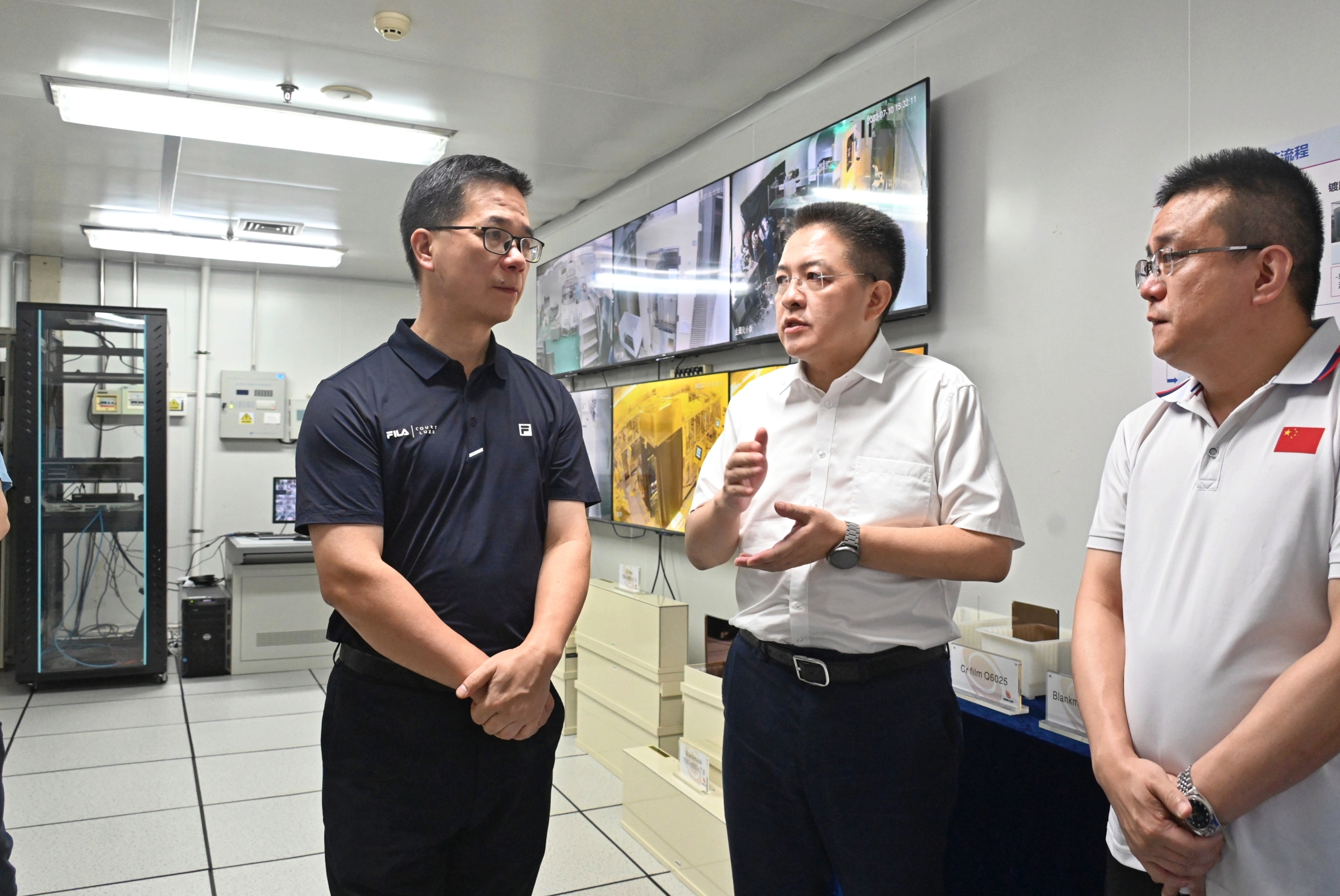 图:肖文伟在普照材料工艺监控室听取掩模基板产品情况介绍